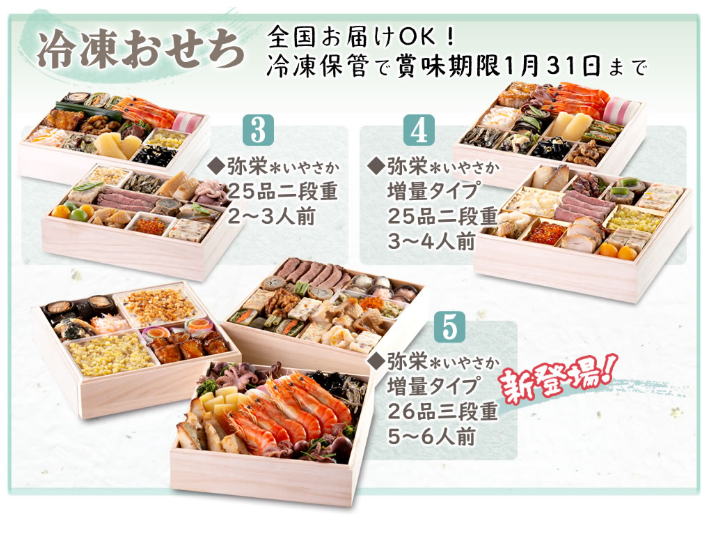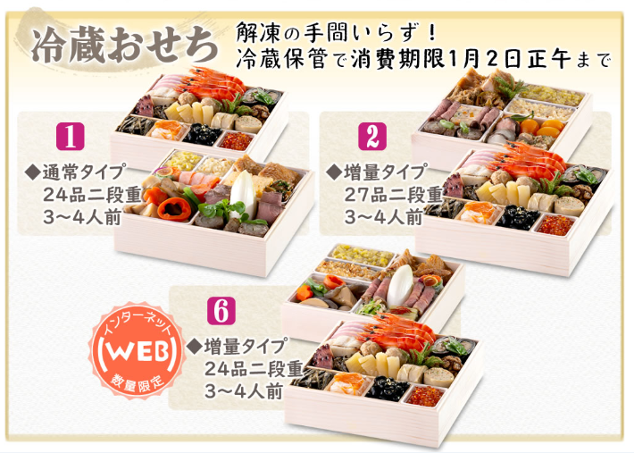 A. おせちは12月31日に冷蔵便でお届けいたします。時間帯のご指定は承っておりますが、日付の変更はできかねますのでご了承ください。