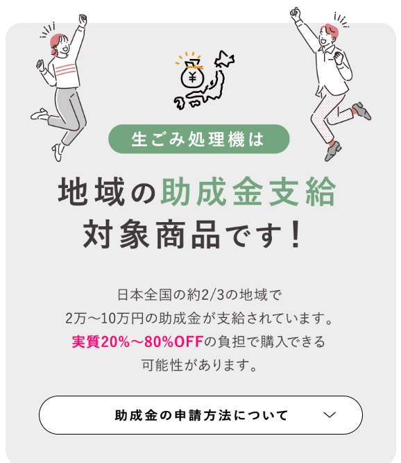 多くの自治体で、生ゴミ処理機購入の助成金制度(2〜5万円)があります。